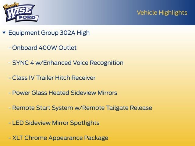 2022 Ford F-150 XLT 4WD, 10-Way Power Driver & Passenger Seats, 18 Black Painted Alloy wheels, 8 Productivity Screen in Instrument Cluster, ABS brakes, Class IV Trailer Hitch Receiver, Compass, Dual Zone Electronic Automatic Temperature Control, Electronic Stability Control, Equipment Group 302A High, Heated door mirrors, Heated Front Seats, Illuminated entry, Integrated Trailer Brake Controller, Intelligent Access w/Push Button Start, Leather-Wrapped Steering Wheel, LED Reflector Headlamps, LED Sideview Mirror Spotlights, Low tire pressure warning, Onboard 400W Outlet, Power Glass Heated Sideview Mirrors, Pro Trailer Backup Assist, Rear Under-Seat Storage, Remote keyless entry, Remote Start System w/Remote Tailgate Release, SYNC 4 w/Enhanced Voice Recognition, Traction control, Trailer Tow Package, XLT Chrome Appearance Package, Zone Lighting.